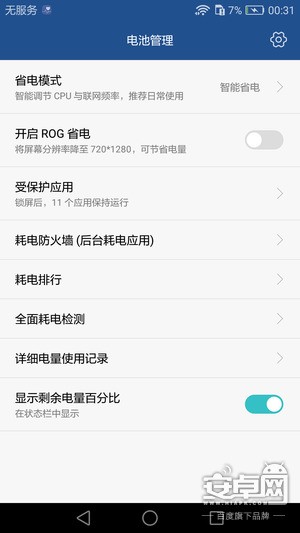 除了大电池是强续航的基础条件之外,EMUI在系统层面也对续航进行了一定的优化。其内置的手机管家 支持电池管理功能,用户可以手动选择省电模式,查看耗电排行,开启耗电防火墙 等等。甚至可以开启ROG省电模式,强制GPU 采用1280*720分辨率进行渲染(P9默认为1080p),减轻Soc的负担,较少耗电。而全面耗电检测更方便用户进行机身耗电状况的查看,无需手动去逐一干预。
