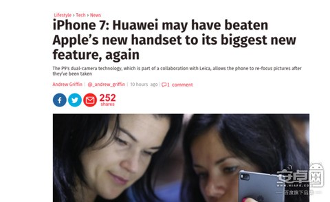 P9很有可能是华为打败苹果 iPhone 7的一大杀手锏,其已经抢先苹果推出双镜头。这是第二次,华为抢在苹果面前推出手机行业创新性功能,去年Mate S上的压感屏技术已经足以证明华为与苹果英雄所见略同。