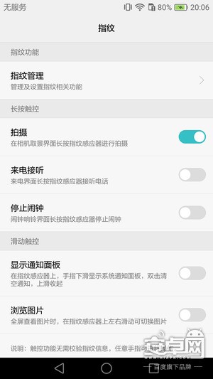 尽管指纹识别 已经成为现在智能手机 的标配,但多数情况下指纹识别模块 仅仅用于手机 解锁和指纹支付,厂商很少针对指纹识别的使用场景做功能上的扩展。EMUI在这些基础功能上新增了拍照、来电接听、浏览图片等功能,在一定程度上丰富了指纹识别的应用场景。