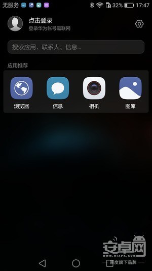 和iOS 9的Spotlight界面相比,EMUI 4.1在这个界面顶部多做了个华为 账号登陆系统,不过其他方面和下滑呼出的全局搜索功能一样,除了应用建议外没有新功能的加入,相信在未来的版本中华为会针对这个界面做进一步的改善。