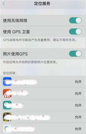 2、点击进入【定位服务】后,在这里你可以看到多项设置和手机里APP是定位权限情况。点开开启【使用无线网络】、【使用GPS网络】、【照片使用GPS】这三个选项。(当按钮显示为蓝绿色则为成功开启)定位服务。