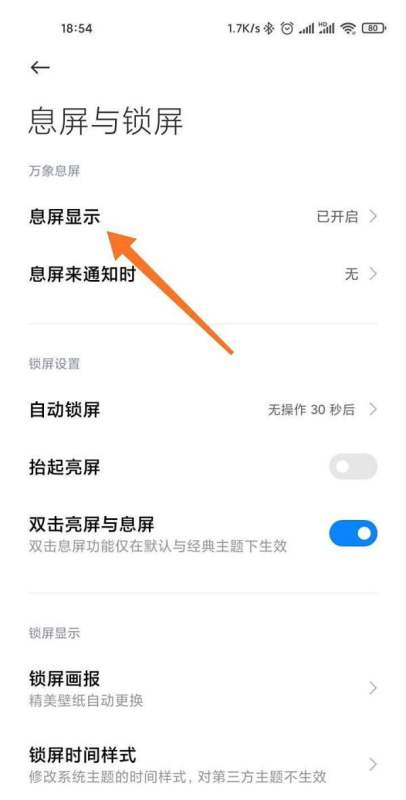 小米手机可通过“息屏与锁屏”设置中的“显示模式”选项,将点击屏幕后的息屏显示时间设为10秒。具体操作如下: