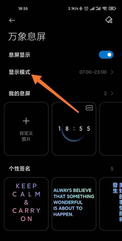 进入显示模式设置:进入“万象息屏”页面后,点击【显示模式】。