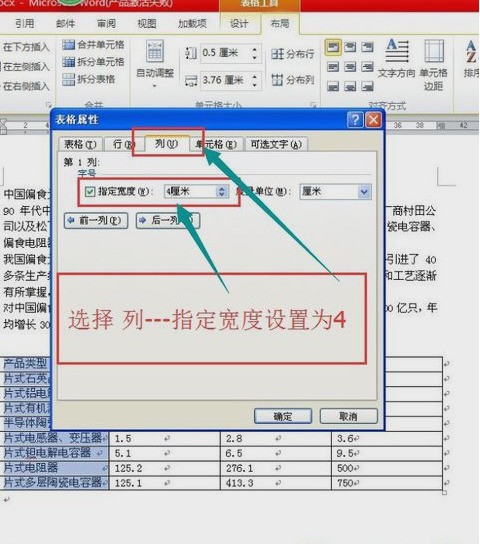 7、在表格属性对话框中选择 列---指定宽度设置为4,最后确定。