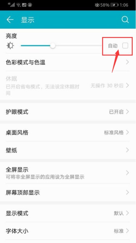 三、进入显示以后,在亮度一行找到”自动“一项,将其勾选上即可开启屏幕亮度自动调节功能。