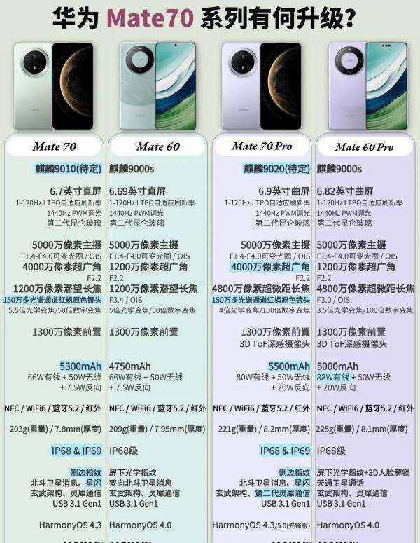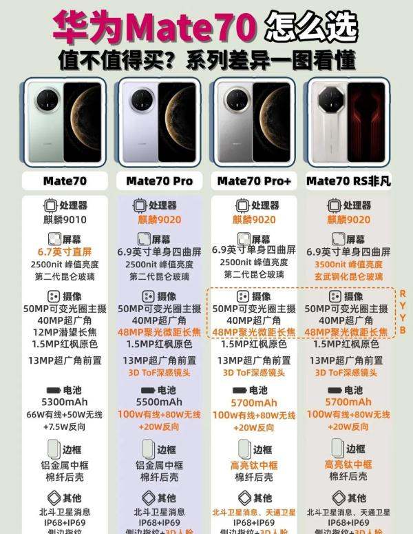 在华为Mate70系列中,包括Mate70、Mate70 Pro、Mate 70 Pro+和Mate 70 RS四款机型,每款都有其独特的配置和亮点。针对您的选择纠结,以下是对四款机型的详细对比和建议: