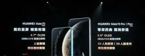 Mate70:6.7英寸直屏+直角中框,支持侧边指纹。Mate70 Pro、Mate 70 Pro+:6.9英寸等深四曲屏+弧形中框,支持3D人脸解锁和侧边指纹解锁。Mate 70 RS:后盖采用陶瓷材质,更加抗摔,其他外观特性与Pro+相似。
