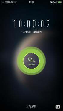 使用超级快充充电器充电,状态栏电池内显示一个双大闪电图标,另外锁屏上有直充充电动画(能量圈比普通充电器大),并提示“超级快充”。