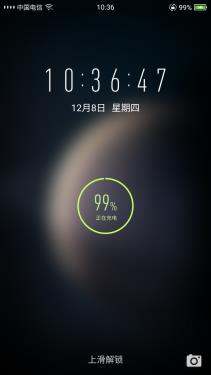使用普通充电器充电,状态栏电池内显示一个“闪电”图标,另外锁屏上充电动画只有一个圆环,并提示“正在充电”。