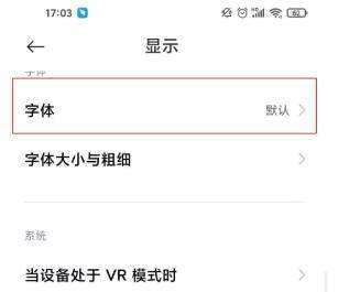 进入字体设置:在显示页面下,浏览并找到字体功能,点击选择打开。