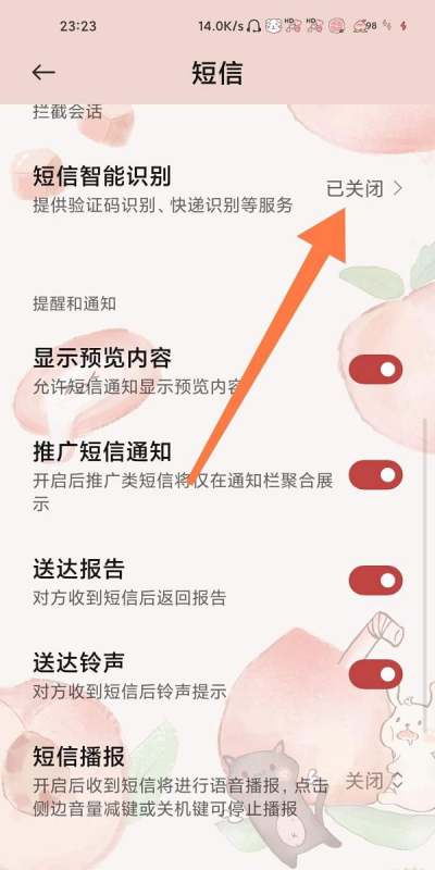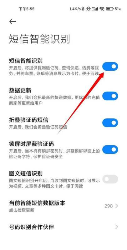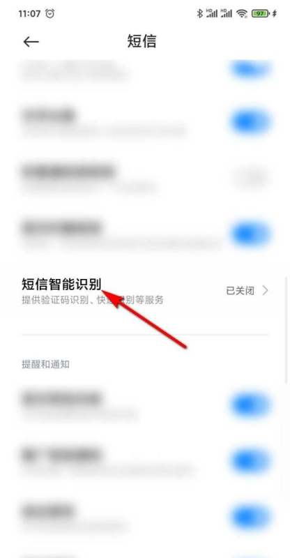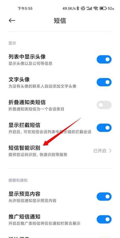 开启短信智能识别:在短信设置页面中,找到“短信智能识别”功能选项,点击进入后将开关滑动至开启状态即可。