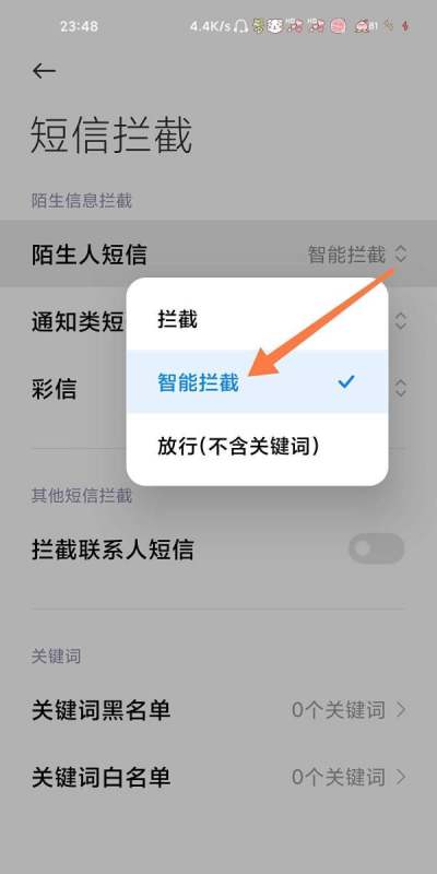 开启智能拦截在短信设置界面中找到“智能拦截”功能,点击右侧开关按钮即可完成开启。