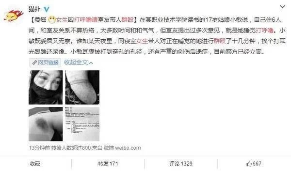 昨天在网上看到一则新闻,17岁的姑娘小敏因为在学校宿舍里睡觉打呼噜,导致大家没有办法休息,所以被同宿舍的两个女生伙同其他班级的几个女孩一起,暴打了她一顿。