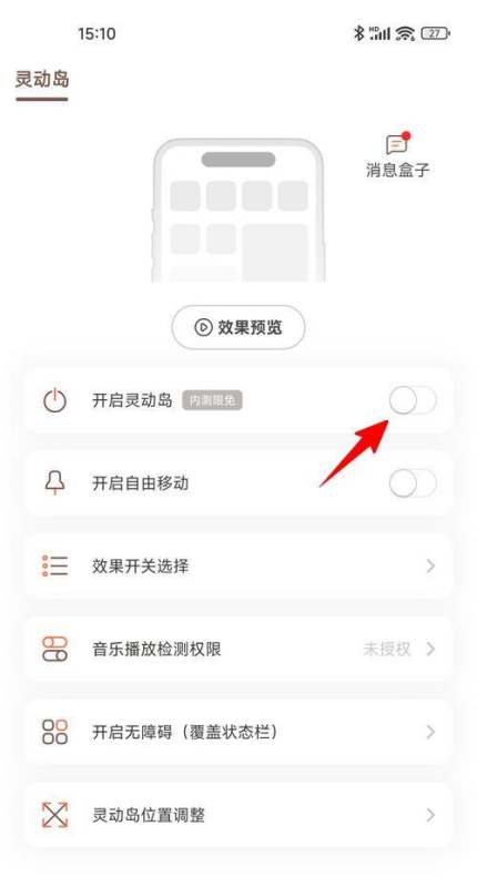 开启功能:点击“开启灵动岛”按钮,激活该功能。