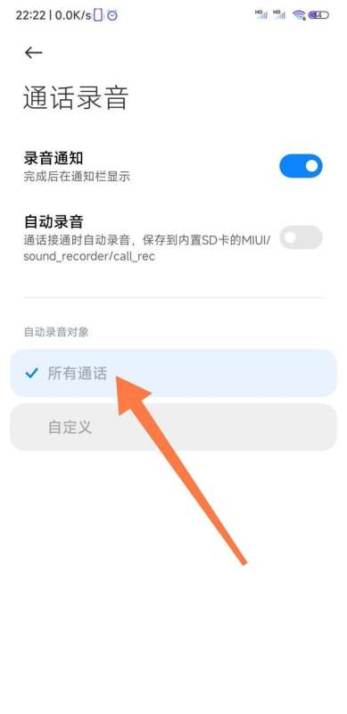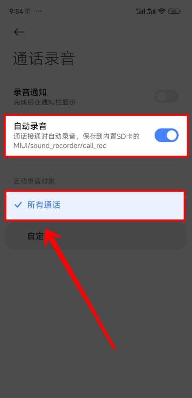 在下方选项中勾选【所有通话】,确保所有来电和去电均自动录音。