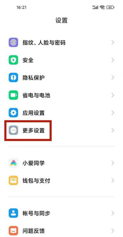 进入设置页面:在小米手机主界面找到并点击【设置】图标,进入系统设置界面。点击更多设置:在设置页面中,向下滑动找到【更多设置】选项并点击进入。
