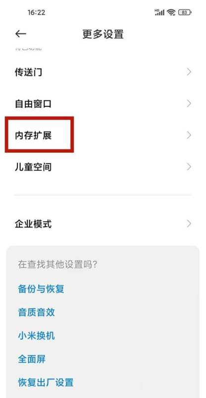 在“更多设置”页面中,继续向下浏览或使用搜索栏输入“内存扩展”,快速定位到该功能。部分系统版本可能将其归类在“存储”或“性能优化”分类下。