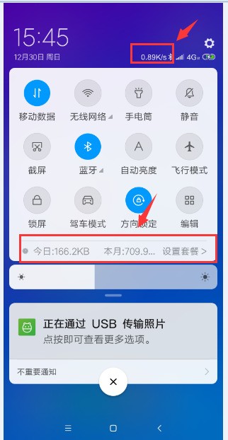5、再接着回到屏幕上方,就可以看到当前的移动数据/流量显示了。