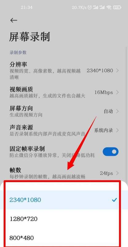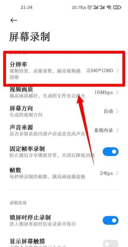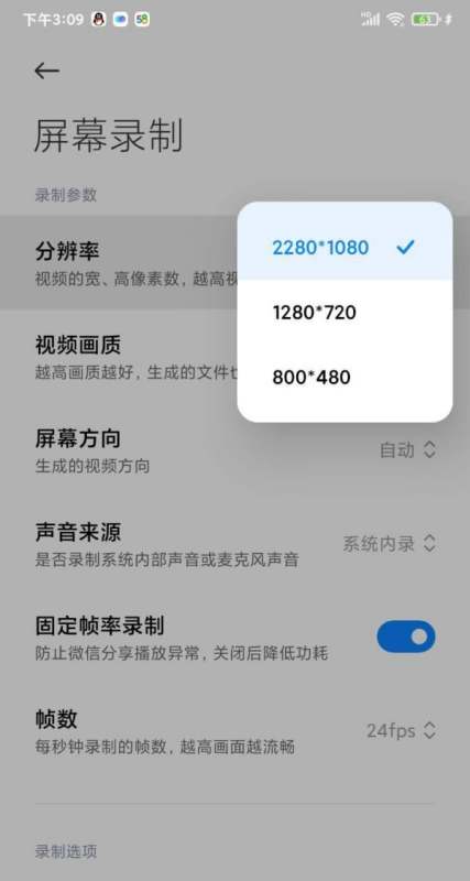 在小米手机上录制屏幕时,更改分辨率的步骤如下: