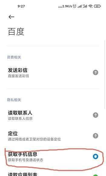 修改手机信息权限在权限管理列表中,点击【获取手机信息】选项,进入该权限的详细设置页面。