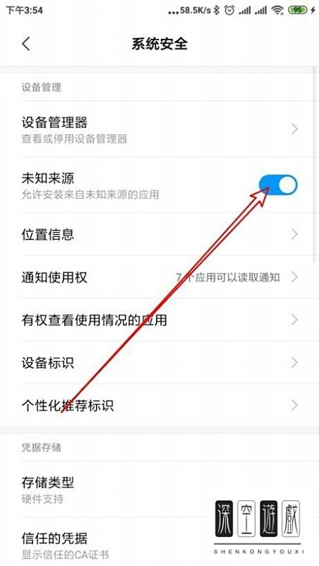 4. 进入系统安全页面后,如图,就可以看到“未知来源”的选项了,点击右侧的开关。