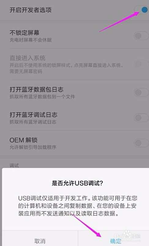 6.在开发者选项界面的下角,找到调试菜单的第一栏USB调试,之后,将其打开,这个时候还是会有系统提示你是否打开,点击确定。