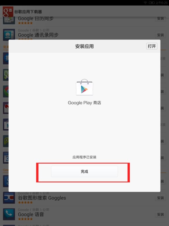 五、等待下载安装,最后出现“完成”提示后进行点击就已经成功安装“谷歌应用商店”了。