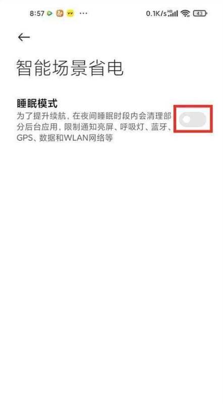关闭睡眠模式:在场景省电界面中,将“睡眠模式”开关滑动至关闭状态。