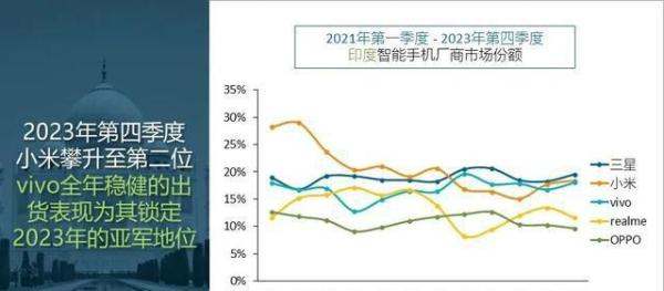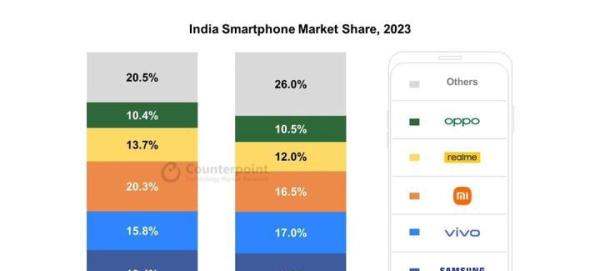 2023年印度智能手机市场格局发生重大变化,三星以18%的市场份额登顶,vivo(17%)紧随其后,小米(16%)跌至第三,realme(12%)和OPPO(10.5%)分列第四、五位。