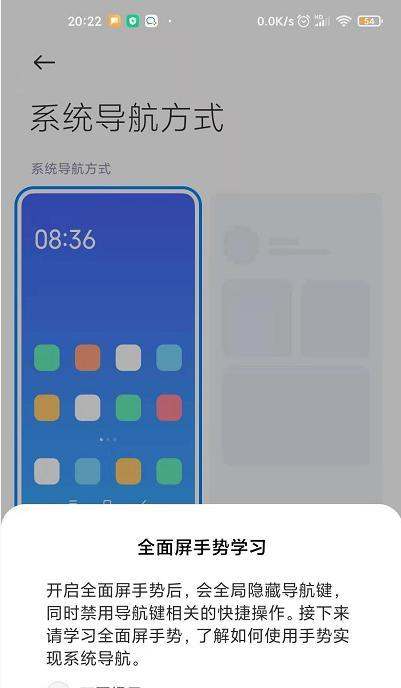 若需自定义手势,可在全面屏设置页面中调整手势提示线显示或切换其他手势样式(如虚拟按键)。设置完成后,系统会弹出提示确认,点击确定即可生效。小米10手机设置全面屏手势的步骤如下: