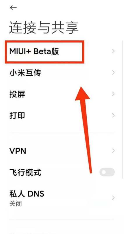 步骤三:点击【MIUI+Beta版】在【连接与共享】界面中,找到【MIUI+Beta版】选项并点击。此选项用于配置MIUI+Beta版的跨设备协同功能。