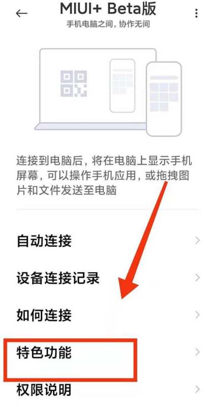 步骤四:点击【特色功能】进入【MIUI+Beta版】界面后,直接点击【特色功能】选项。此处会展示MIUI+Beta版提供的跨设备协作、文件互传等专属功能。
