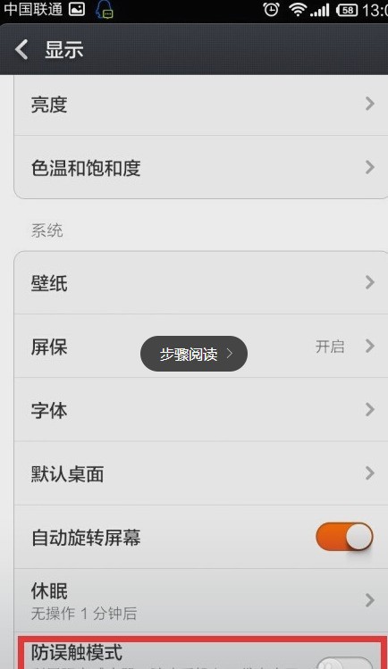 三、点击进入“显示”功能里面之后,在“显示”功能页面的最下角找到“防误触模式”,如下图所示。
