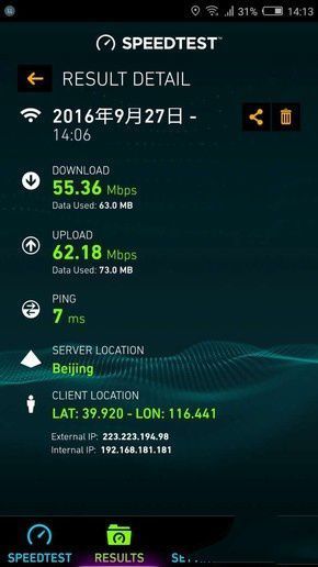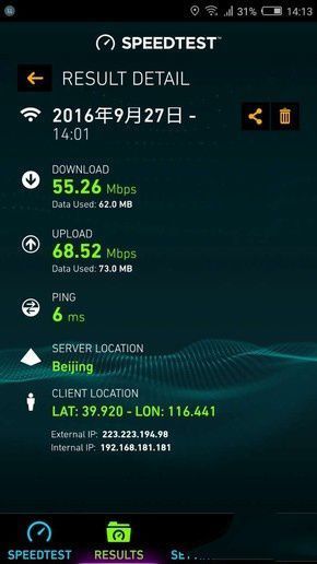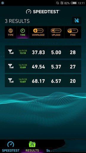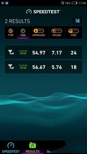 在100Mbps的大WiFi环境中,努比亚Z11工位测试网速结果显示,其下行速度稳定在55Mbps以上,相比移动网络逊色不少,但贵在上行速度最高达68.52Mbps,比4G模式高出好几个级别。公司环境下,上班儿时间,几十号人共用一个WiFi,这种抢网速度兼简直就是拦路虎级别的。