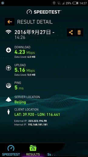 正如你所见,进入卫生间的一刹那,WiFi信号急剧下降,满格掉到了断网红线。好在网速还在,测试结果显示,这时候的下载速度和上传速度都跌到了个位水平。人们常说,能在卫生间能待多久跟WiFi信号成正比。以这样的测试结果来看,估计也就能待个十来分钟吧!