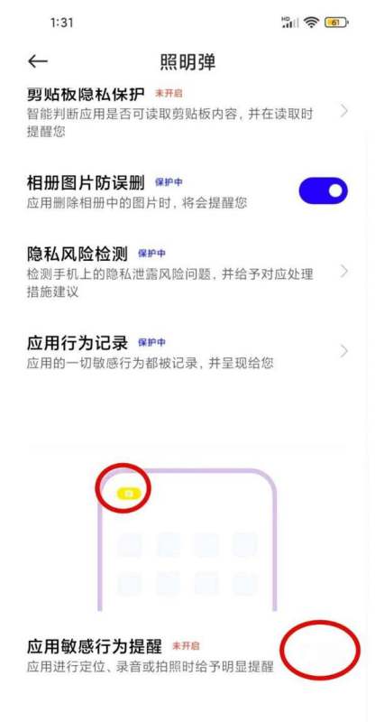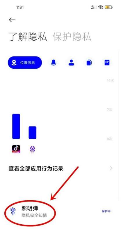 小米手机左上角应用行为记录可通过关闭“照明弹”功能实现,具体步骤如下: