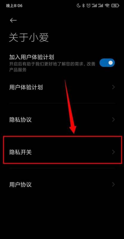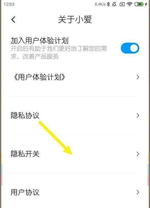 步骤四:点击隐私开关选项在关于小爱界面中,找到“隐私开关”选项,点击它进入相关设置页面。