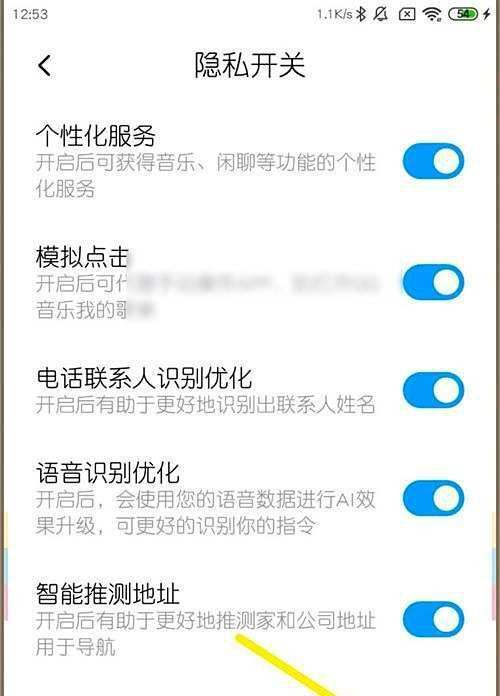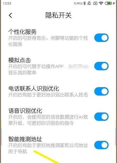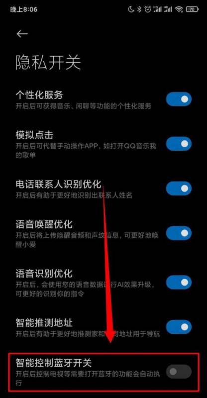 步骤五:关闭智能控制蓝牙开关在隐私开关设置页面中,找到“智能控制蓝牙开关”选项,其后面有一个开关按钮,点击该按钮,当按钮显示为关闭状态时,即成功关闭了小爱同学智能控制蓝牙开关。