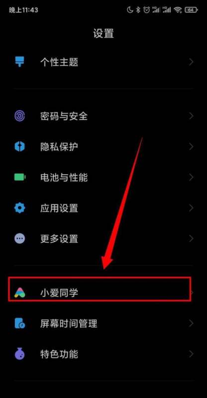 步骤二:点击小爱同学选项在设置界面中,通过上下滑动查找“小爱同学”选项,找到后点击进入。