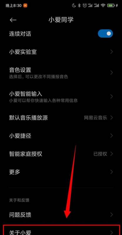 步骤三:点击关于小爱进入小爱同学设置界面后,继续查找“关于小爱”选项并点击进入。