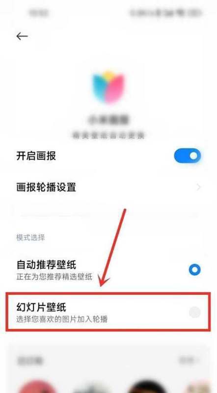 选择幻灯片壁纸功能:进入锁屏画报设置后,点击“幻灯片壁纸”选项。