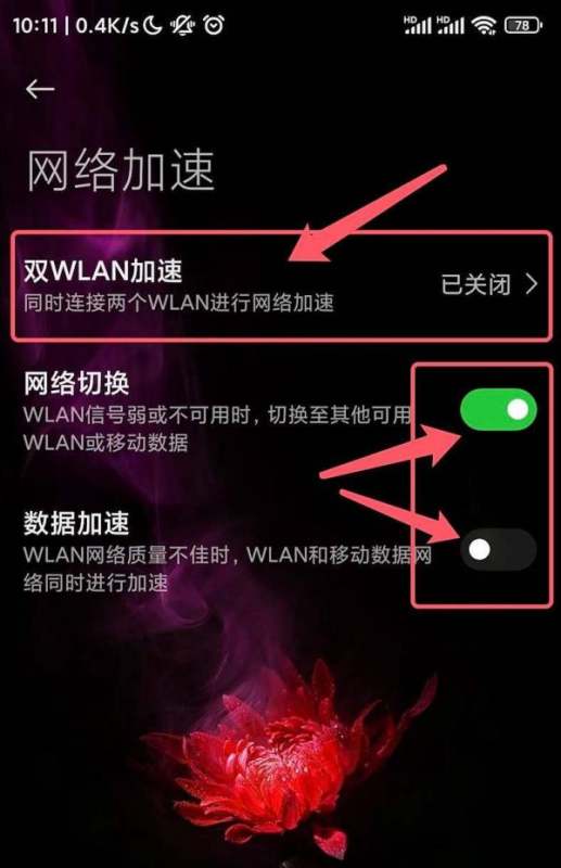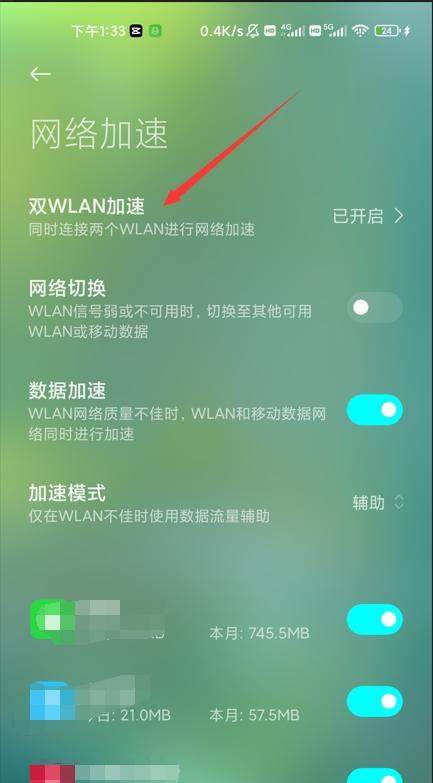 第四步:开启双WLAN加速在网络加速页面中找到双WLAN加速开关,将其滑动至开启状态。系统会自动搜索并连接第二个WiFi网络(需提前保存两个WiFi密码)。
