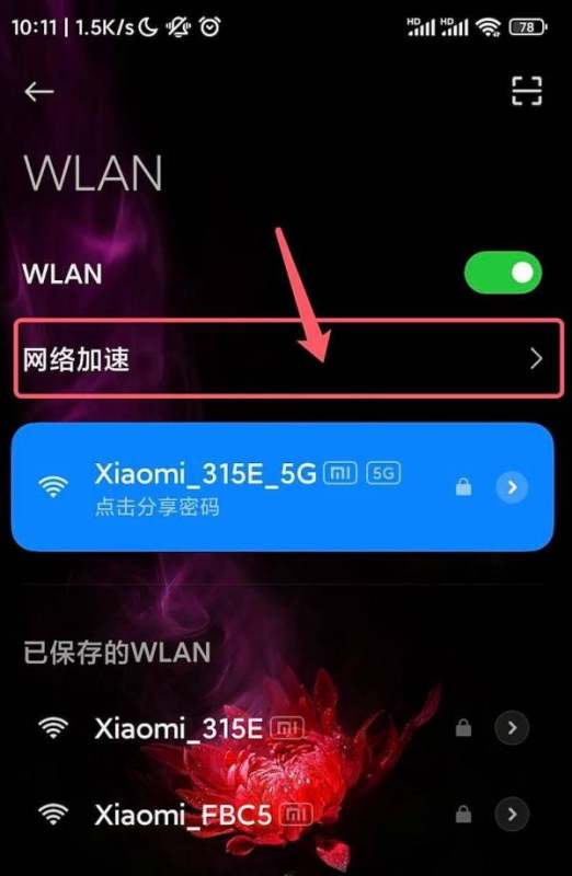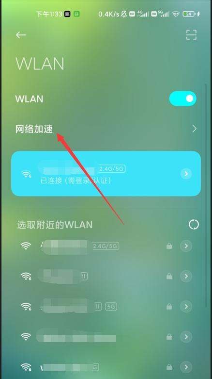 进入网络加速设置:进入【WLAN】设置页面后,选择【网络加速】。