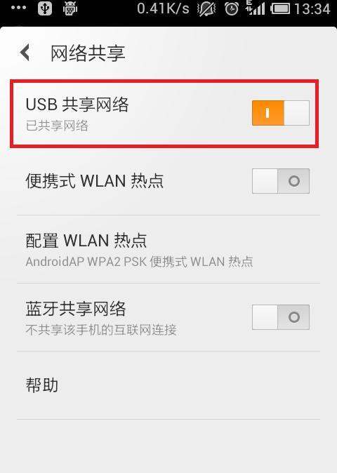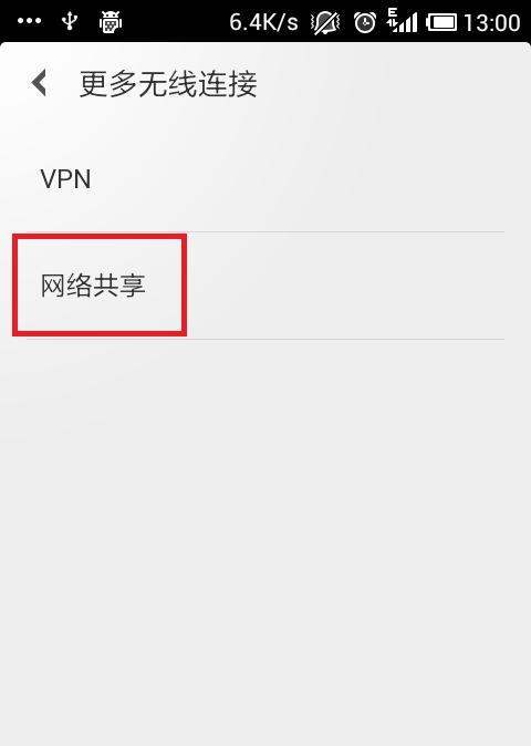 第四步:启用USB共享在网络共享界面中,点击“USB网络共享”选项(参考下图红色标识),开启功能后电脑即可通过本地连接使用手机流量。