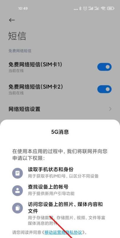 开启5G消息功能:在“5G消息”设置界面中,点击“开启”按钮。开启后,移动用户即可默认为通过WLAN或移动网络发送短信,无需额外付费。