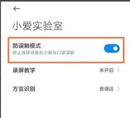 第四步:开启防误触模式在【小爱实验室】页面中,找到【防误触模式】开关,将其滑动至蓝色开启状态即可生效。