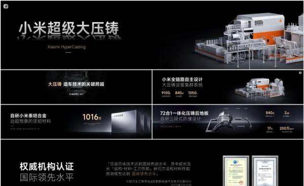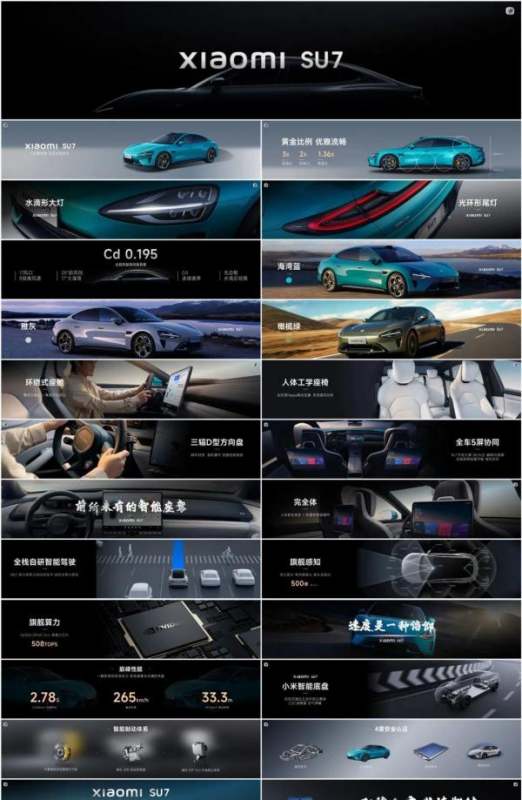 超级电机:介绍了小米汽车SU7采用的超级电机技术,包括其性能优势、能效比等。高压平台:阐述了高压平台技术对于提升电动车续航能力的重要性,以及小米汽车在这方面的技术突破。超级大压铸:介绍了超级大压铸技术在车身制造中的应用,以及它如何帮助小米汽车实现轻量化、高强度等目标。四、产品亮点