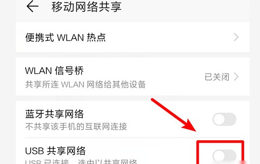5、进入移动网络共享界面后,把USB共享网络的按钮打开,手机网路就可以共享到电脑了。