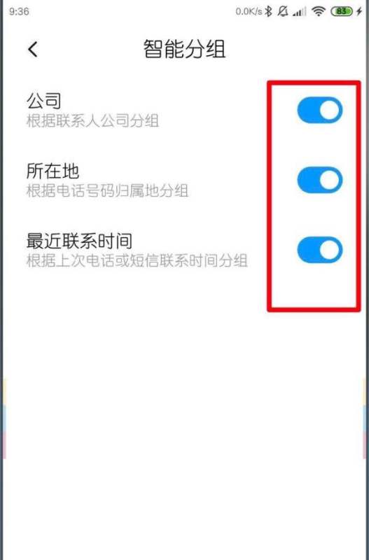 关闭分组规则开关依次点击公司、所在地、最近联系时间等分组规则的开关按钮,将其从蓝色(开启状态)切换为灰色(关闭状态)。