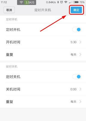 开机时间:点击“开机时间”,选择具体时间(如早上7:00)。